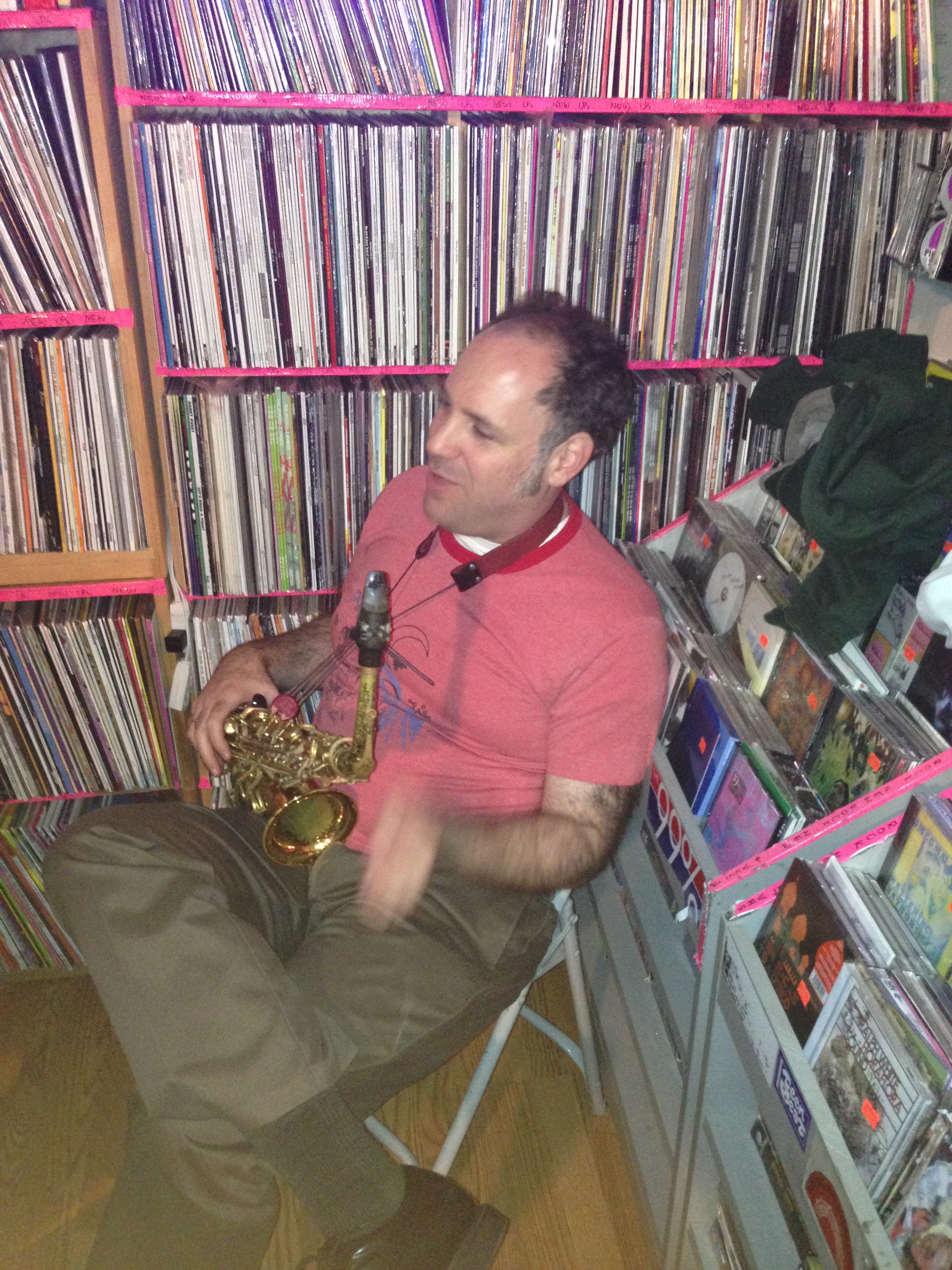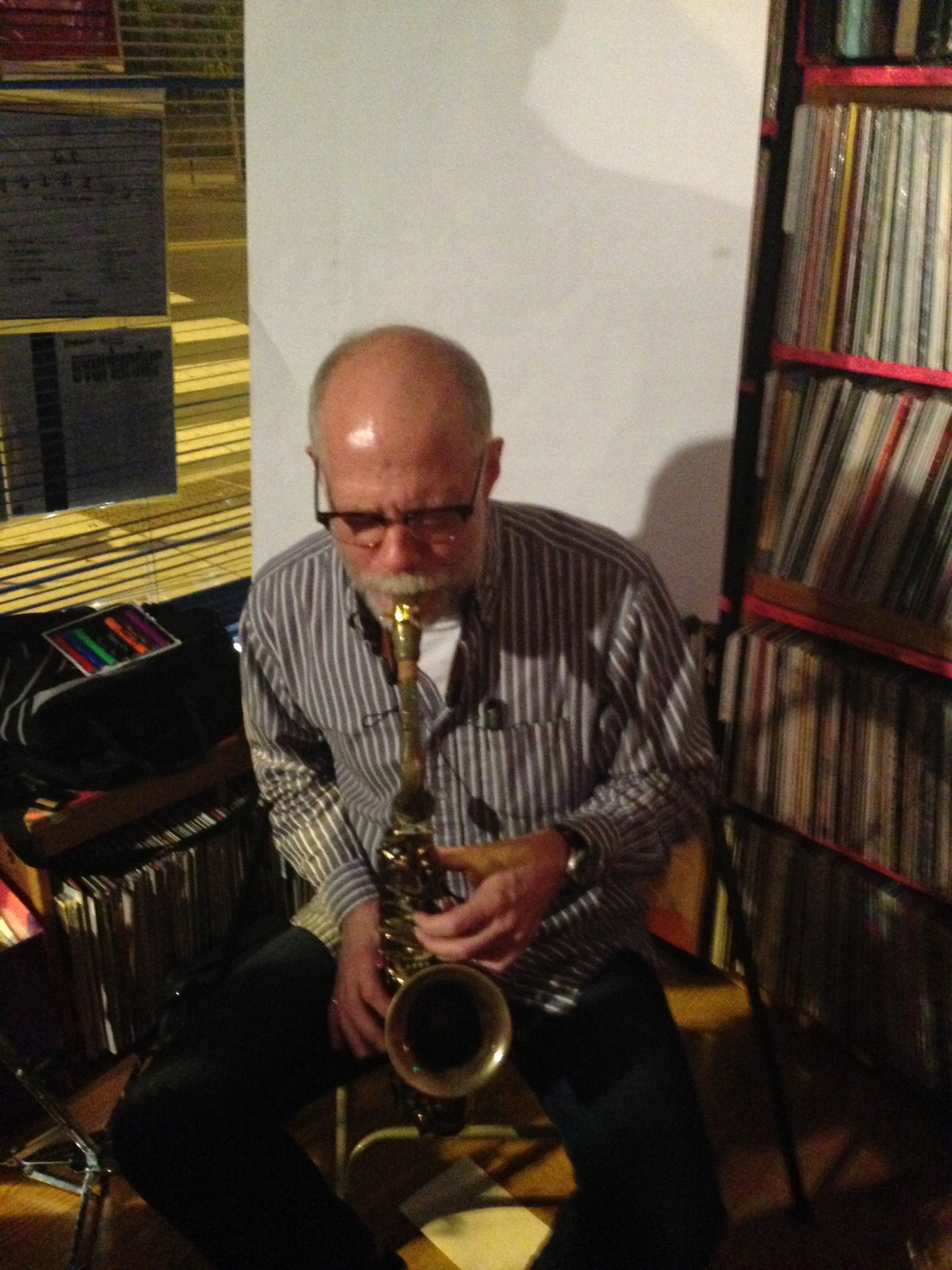 This puts me in a peaceful mood just two tuneful sax lines linear buzzing like cicadas on August trees the Om chant the splitting of sugar cane the forest in the rain and I pause and wonder my head is hard my hands are soft the record room is warm as are the sounds turning to clarion trumpets glistening with spittle Dave’s gold wedding ring round ring finger just stays still as the others jitter Steve gets growling wild but tame as a fox in a strawberry patch and now they echo loud grand and glorious Dave with heavy harmonics it’s the intro to Coltrane’s Meditations now butchering Butcher slow undulating waves of sheets of sound Glossolalia of brass and pads